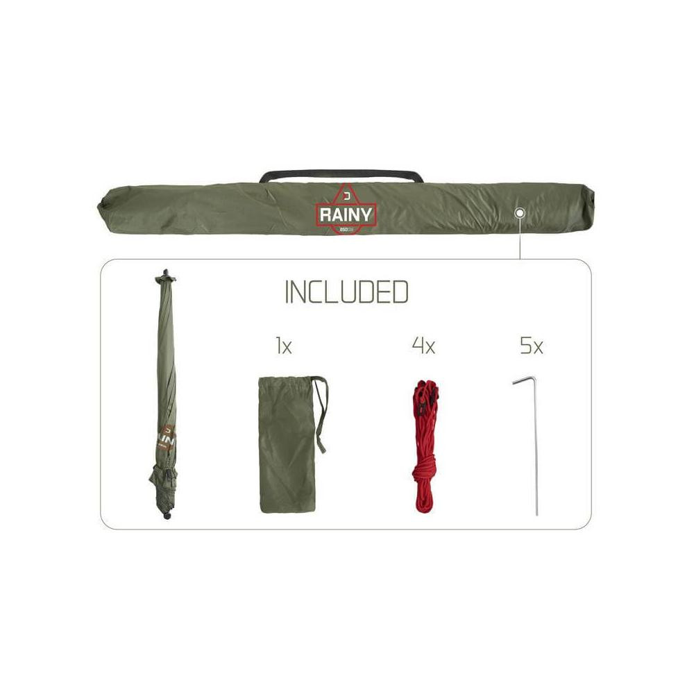A Delphin RAINY esernyő tökéletes választás rövid horgásztúrákhoz, ha nem akarja, hogy elkapja a rossz idő. Kiváló védelmet nyújt a nap erős sugarai, a harmat vagy bármilyen csapadék ellen. Fő előnyei a gyors felállíthatóság, a könnyű üzembehelyezés, illetve a könnyű súly. Ezenkívül azonban a kupola sajátos szögletes alakja is egyedi. Ennek köszönhetően az esernyő nagyobb területet fed le, mint egy azonos méretű hagyományos alakú esernyő.