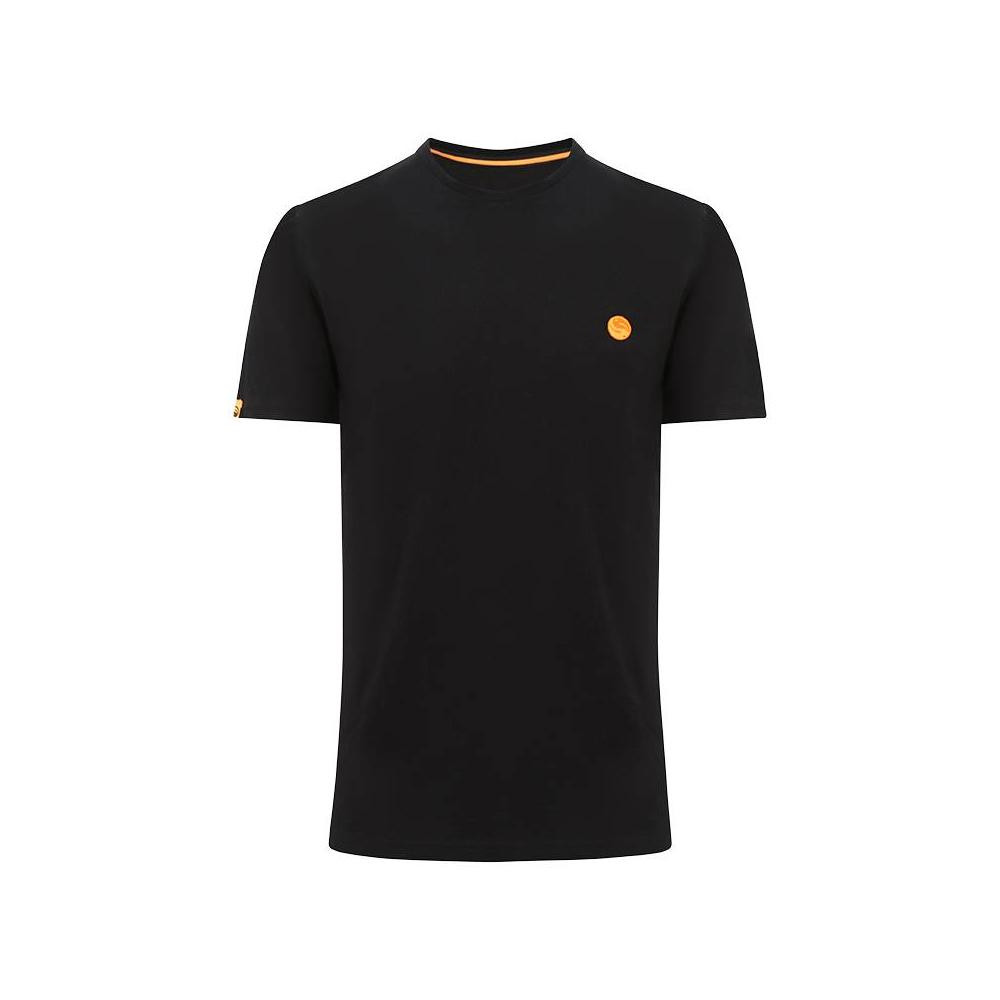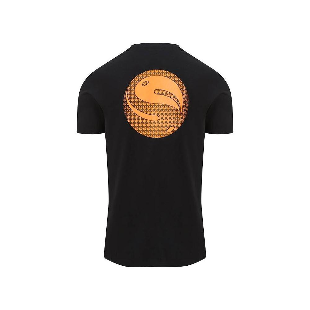 könnyű fekete rövid ujjú póló, elöl kis hímzett narancssárga Guru logóval, hátul nagy Guru logóval.
