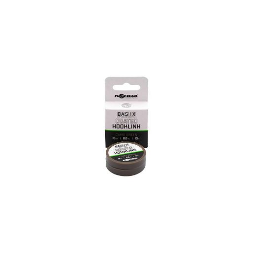 A Korda BASIX Coated Hooklink egy puha, bevonatos fonott anyag, amely mindenféle különféle felkínáláshoz alkalmazható a süllyedő csalik, a wafterek és az pop-up-ok számára. A belső fonat és a külső bevonat is finom „camo green” színű, amely biztosítja, hogy bármilyen típusú tófenékhez illeszkedjen, amelyen horgászik. Egyenesen fekszik, gőzölés nélkül, és kiváló gubancolásgátló tulajdonságokkal rendelkezik, ráadásul a bevonat könnyen visszahúzható, ahol szükséges, hogy csuklópántot hozzon létre és extra mozgást biztosítson a szerelékének. Nagyon jól köthető a külső bevonat törése nélkül, és jó szakítószilárdság érhető el bármely hagyományos horgászcsomóval.
